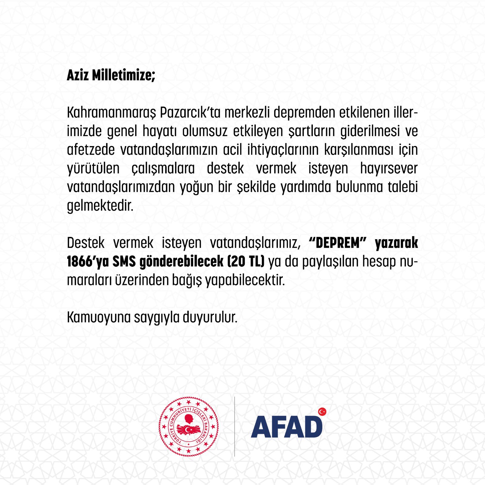 Depremden etkilenen illerimizde yürütülen çalışmalara yönelik yardımda bulunmak isteyen vatandaşlarımız “DEPREM” yazarak 1866’ya SMS (20 TL) gönderebileceği gibi T.C. İçişleri Bakanlığı Afet ve Acil Durum Yönetimi Başkanlığı (AFAD) tarafından paylaşılan banka hesap numaraları üzerinden de bağış yapabilecektir.